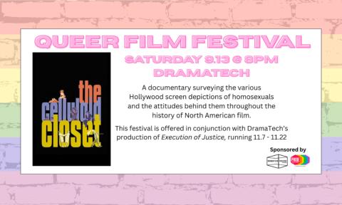 Join DramaTech and Pride Alliance for the first in a series of queer film screenings featuring movies and documentaries about queer history! Our first movie is the Celluloid Closet, a documentary surveying the various Hollywood depictions of homosexuals and the attitudes behind them throughout the history of North American film.