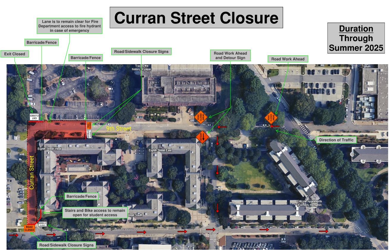 Beginning Monday, March 24, a section of 9th Street and Curran Street (including sidewalks) will be closed through August 2025 for multiple utility tie-ins and infrastructure work related to the Curran Street Residence Hall. Parking and Transportation Services will be rerouting bus traffic and detour signage will be installed for vehicular and pedestrian traffic. Thank you for your patience and cooperation during this time.