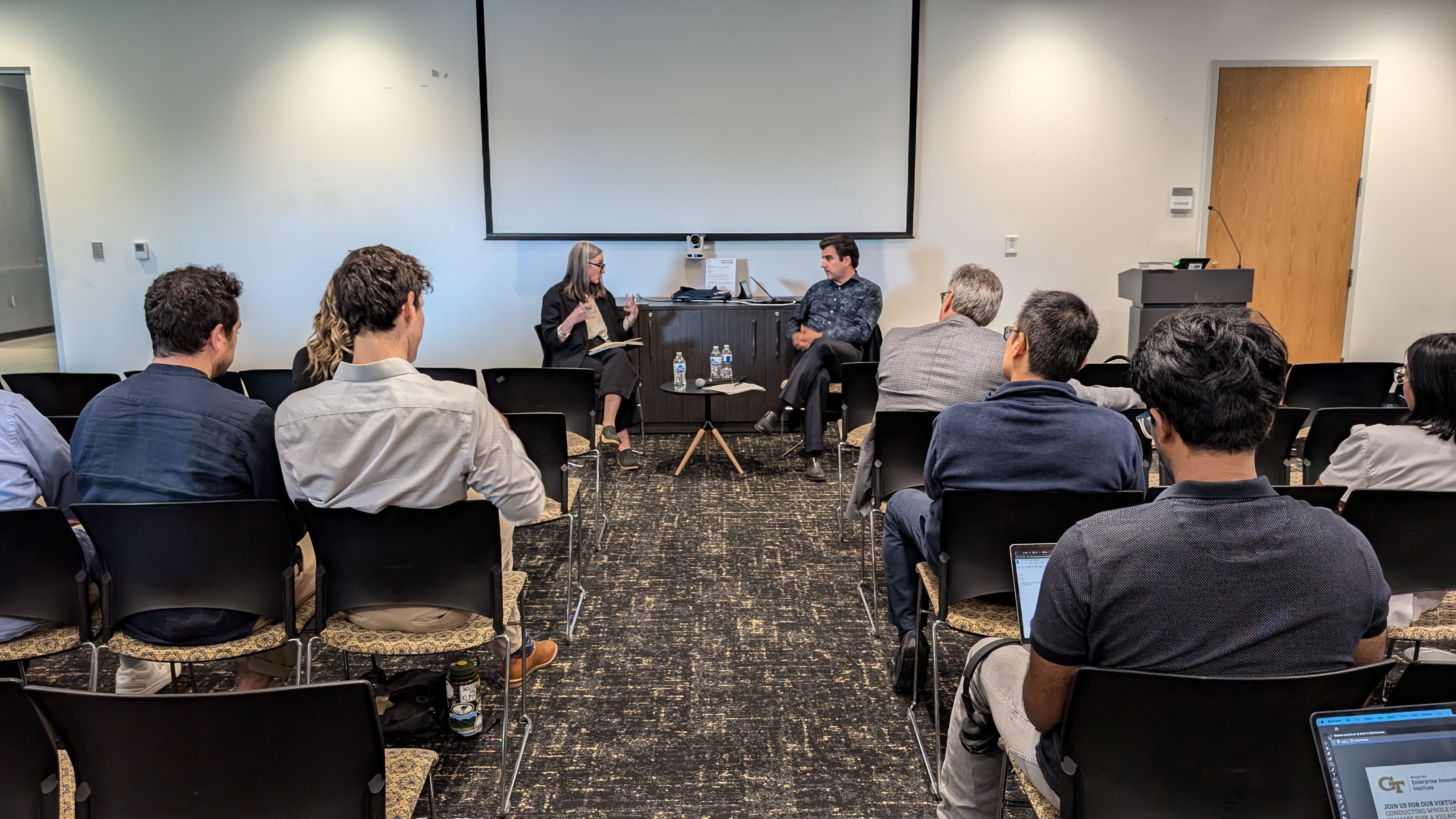 Jenna Jordan, left, associate professor and associate chair in the Sam Nunn School of International Affairs, talks with Tim Sweij, director of research at The Hague Centre for Strategic Studies and a senior research fellow at the Netherlands Defence Academy's War Studies Research Centre, during a visit to Georgia Tech on Oct. 8, 2024.