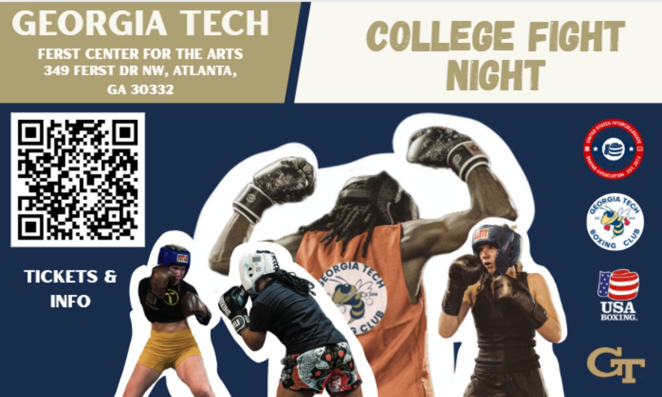 This is our annual USA Boxing sanctioned amateur collegiate boxing showcase involving USIBA member schools from around the country. Each fight will have 3 rounds, 2 minutes apiece. Fights are official amateur bouts and go on fighters’ USA Boxing record. Tickets can be found at https://tickets.arts.gatech.edu/Online/default.asp
