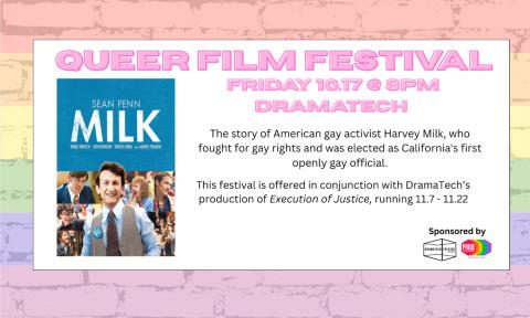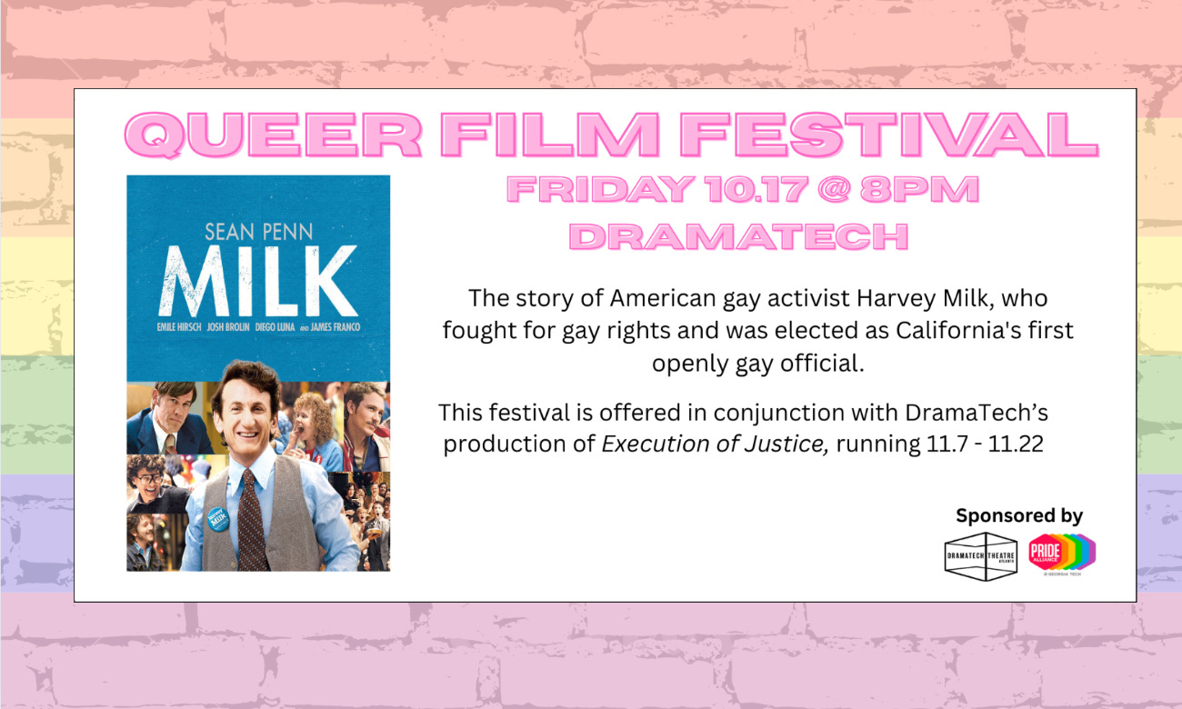 Join DramaTech and Pride Alliance for a series of queer film screenings featuring movies and documentaries about queer history! This week, we're watching Milk, a documentary about the story of gay rights activist Harvey Milk, who was elected as California's first openly gay public official. Stick around after the screening for a short discussion about the documentary. We'll have popcorn and some light snacks!