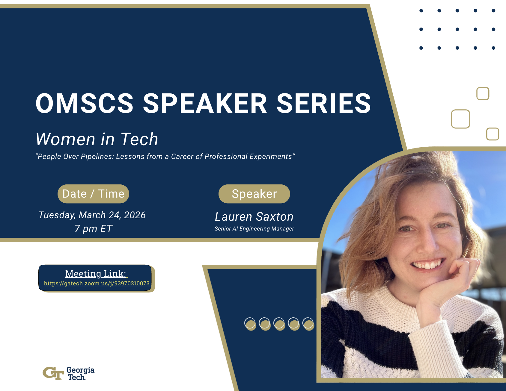 Abstract: "If you feel like youʼre supposed to have your entire 10-year career plan mapped out by the time you finish your OMSCS degree, Iʼm here to tell you to breathe. My journey to becoming a successful AI Engineering leader started with an Electrical Engineering degree I didnʼt love and a series of 'what if' pivots—from consulting in NYC to navigating an IPO with NerdWallet and eventually specializing in leading greenfield AI projects. In this talk, Iʼm sharing the real-world version of a career in tech: one built on serendipity, hard work, and the courage to treat your professional life like a beta test. Weʼll talk about how to fearlessly seize opportunities when they appear, why I believe 'Human-First' leadership is the only way to build a team that lasts, and why trying a role—whether it's as a tech founder or a technical product manager —is never a waste of time, even if it doesn't work out. Come for the career advice, stay for the honest look at what happens when you stop worrying about 'permanent' moves and start following your interests.