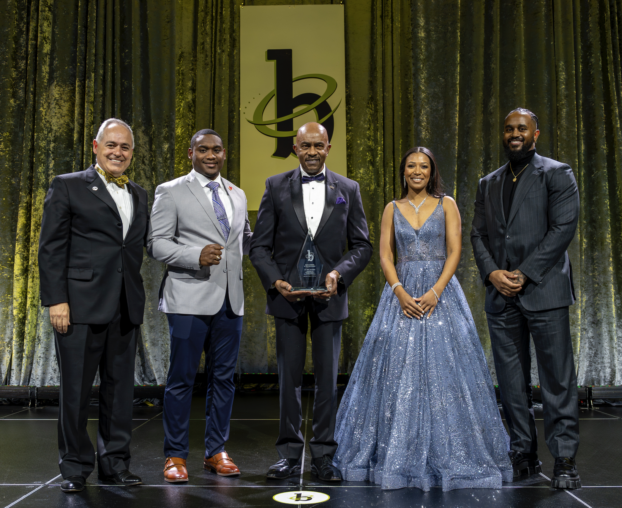 Ron Johnson (middle) accepting the 2025 Black Engineer of the Year at the Black Engineer of the Year STEM Conference. From left to right: Georgia Tech President Ángel Cabrera, Ahmad Bradshaw, Ron Johnson, Alana Winns, Ian Johnson. Submitted photo.