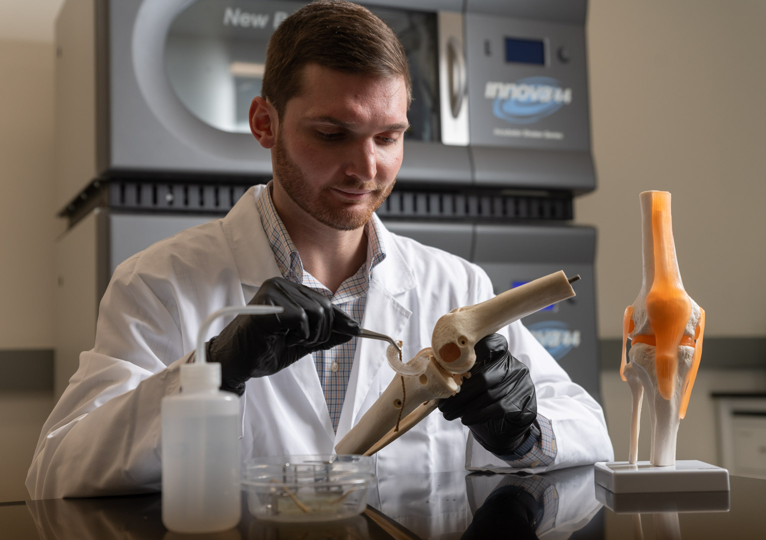Jonathan Schwartz, OrthoPreserve's founder and CEO, places the meniscus implant into position in a knee model. Credit: Rob Felt