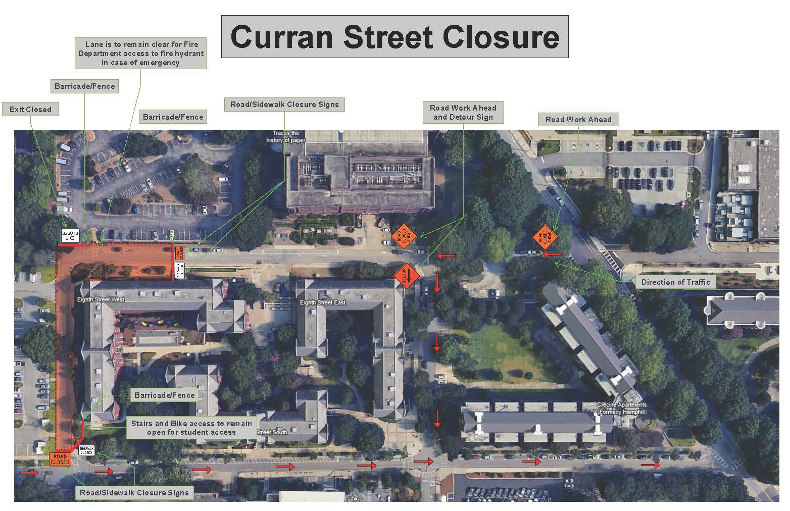 Curran and Ninth Streets will be closed beginning Monday, Aug. 18 and continue through early October. Please use alternate routes for bus, vehicular, and pedestrian traffic, similar to the routes used during the summer. Thank you for your cooperation as we continue to make progress on the new residence hall.