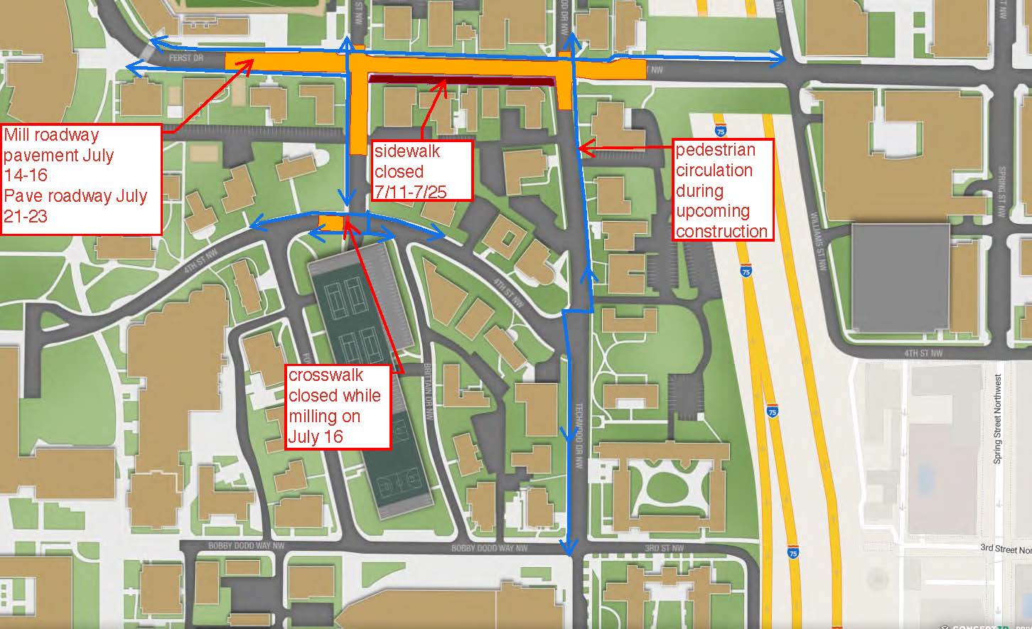 - Milling operations will take place along Fifth Street and Ferst Drive, from Russ Chandler Stadium to the Fifth Street Bridge, July 14 – 16.