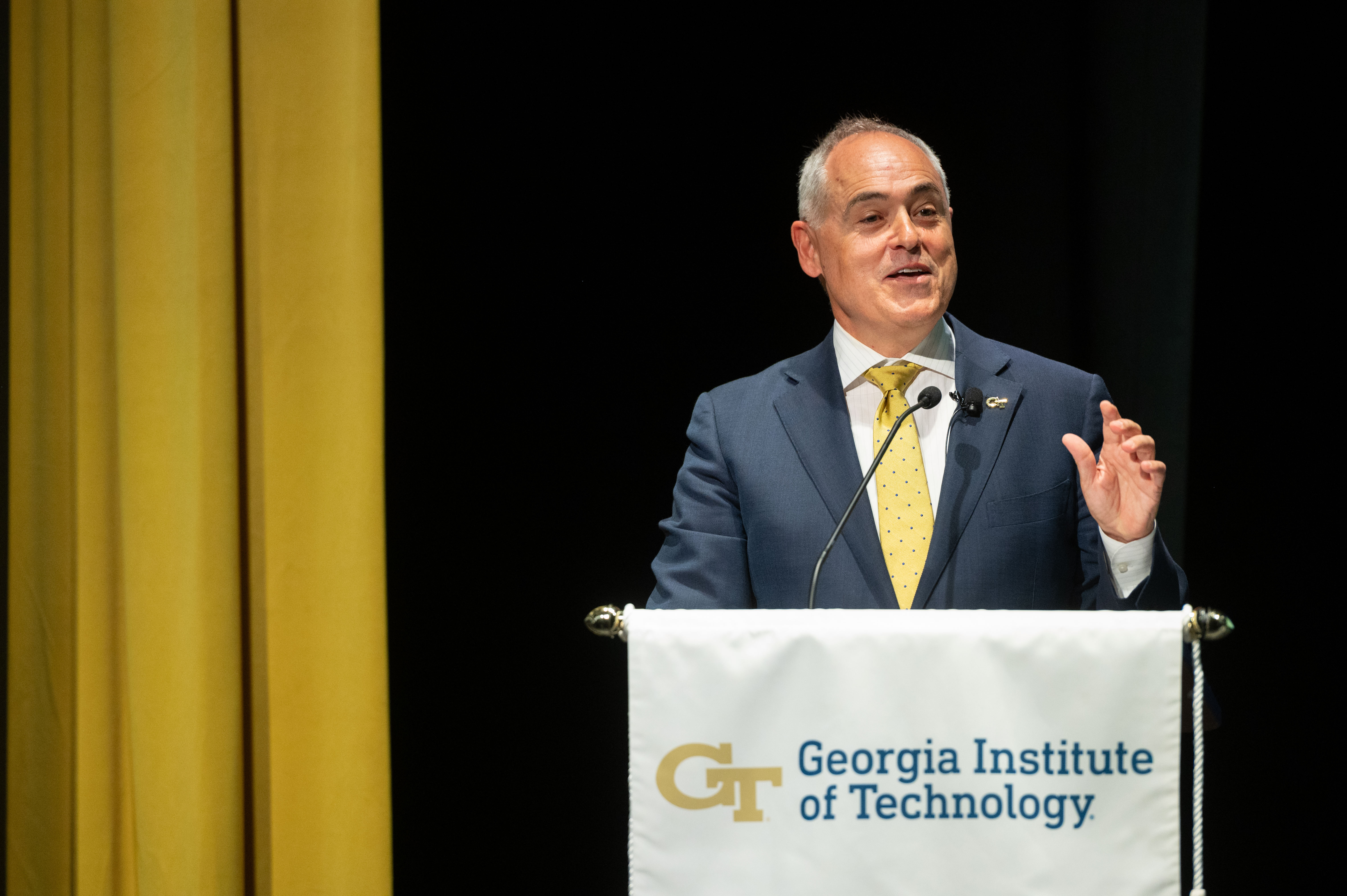 During his 2025 Institute Address in the Walter G. Ehmer Theater, the president revealed that record enrollment, campaign fundraising, and research expenditures have positioned Georgia Tech ahead of schedule on the plan that runs through 2030.