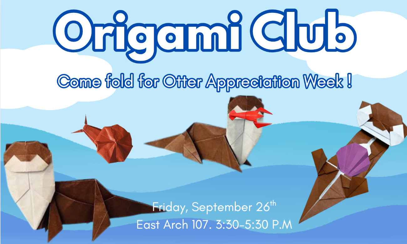 Come to Origami Club! We fold origami each week with a different theme. This week, we'll be folding otters and related critters in celebration of Otter Appreciation Week! We will teach you. We are fun. We are free. We are awaiting you.