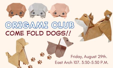 Friday August 29, 2025 3:30PM - 5:30PM Contact Dhruv Kulkarni Location Location Room 107, East Architecture Building Videos Come to origami club! We fold origami each week with a different theme. This week, we'll be folding doggos! Paper puppies are easier to take care of than real ones. We will teach you. we are fun. we are free. we are awaiting you. Related Link Origami Club Event Category Arts and Performance Invited Audiences Faculty/Staff Graduate students Undergraduate students